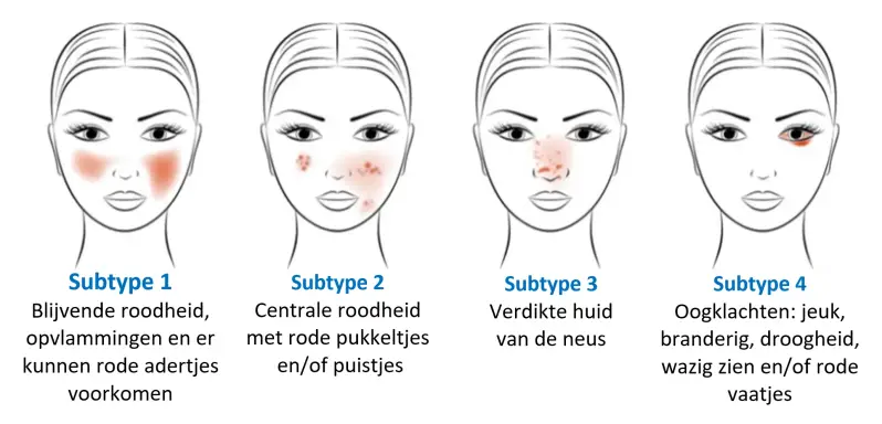 Rosacea is een veelvoorkomende, chronische huidaandoening in het gezicht. Het ziet er bij iedereen weer anders uit. Bij de één is het alleen aanwezig op de neus, en de ander heeft knalrode wangen. De meest voorkomende symptomen zijn blijvende roodheid, bultjes, adertjes en vlekjes, vaak samen jeuk en een branderig gevoel.